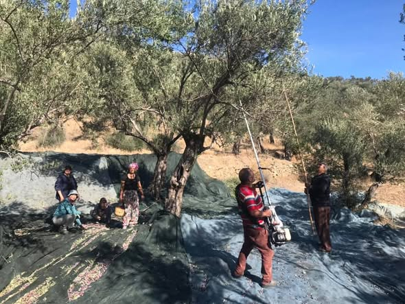 Dün sabah hasata başladık biz. Semaver zeytinliğe taşındı. Kasalar, brandalar, sırıklar, makineler ve biz, zeytin ağaçları arasında yerlerimizi aldık. Bu yıl zeytinin az/yok yılı. Ağaçlarda fazla zeytin yok, küçük bir ekiple çalışıyoruz.